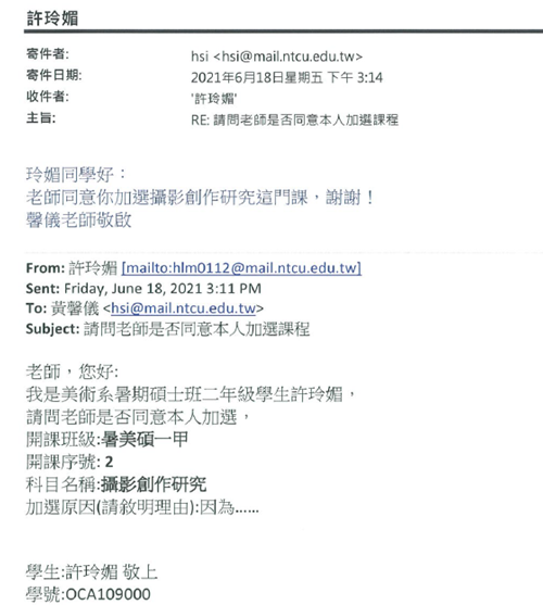 步驟2.請同學於人工加退選課時程截止日前寄E-mail給授課教師,徵詢教師是否同意加退選,電子郵件範例請參閱下圖。